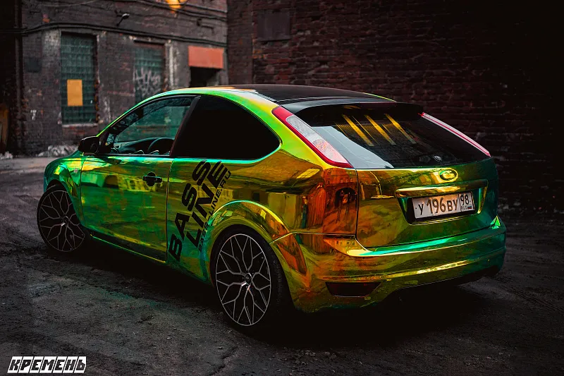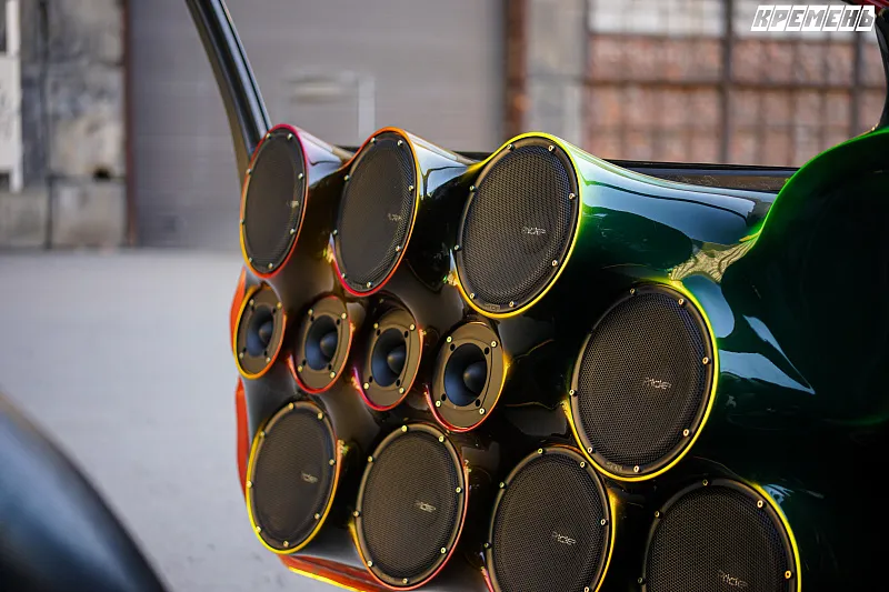 Немного о актуальной на сегодня системе: сердцем таких проектов является питание, его здесь более чем с запасом: 12 секций литий титаната общей емкостью 540 а/ч, заряжает все это генератор Dc power xp 270. Оформление сабвуферного звена Бандпасс 4го порядка на шесть сабвуферов Pride T15, которые работают в данном оформлении уже третий год без проблем и поломок. Нам тут даже нечего не хотелось менять, единственное, всегда волновал вопрос "визуализации" работы системы. Для этого мы решили изготовить трех сантиметровое триплекс стекло, вместо нагрузочной стенки, тем самым сделав оформление абсолютно прозрачным. Написать это просто, а на реализацию данной идеи ушло более двух месяцев - найти стекольную фабрику которая была готова изготовить данную заготовку оказалось не просто, да и придумать как крепить стекло весом более 50 килограмм оказалось той еще задачей. Несмотря на все трудности мы добились реализации нашей идеи. Единственный в России демокар с полностью прозрачной нагрузочной стенкой в оформлении. Что же касается фронтальной акустики, то громкости в салоне на двенадцати пар Pride Violet было достаточно, но на открытие двери не хватало доворота у обшивок и динамики были направлены в крыло автомобиля, и тот факт, что компания Pride car audio не стоит на месте и с каждым годом работает над улучшением показателей своей продукции выпуская новые модели акустики подтолкнул нас на изготовление новых дверных карт. В этот раз обшивки были изготовлены под восемь пар динамиков Pride solo neo 8 и четыре пары рупоров Pride H2. Так как в этот раз обшивки изготавливали с большими доворотами на улицу, то получили очень сложную форму для перетяжки детали в кожу, поэтому, пришли к идее покрасить обшивки в глянец, но с учетом внешнего вида автомобиля. Отсюда и имеем такой безумный трехсоставной кэнди с ксераликом.