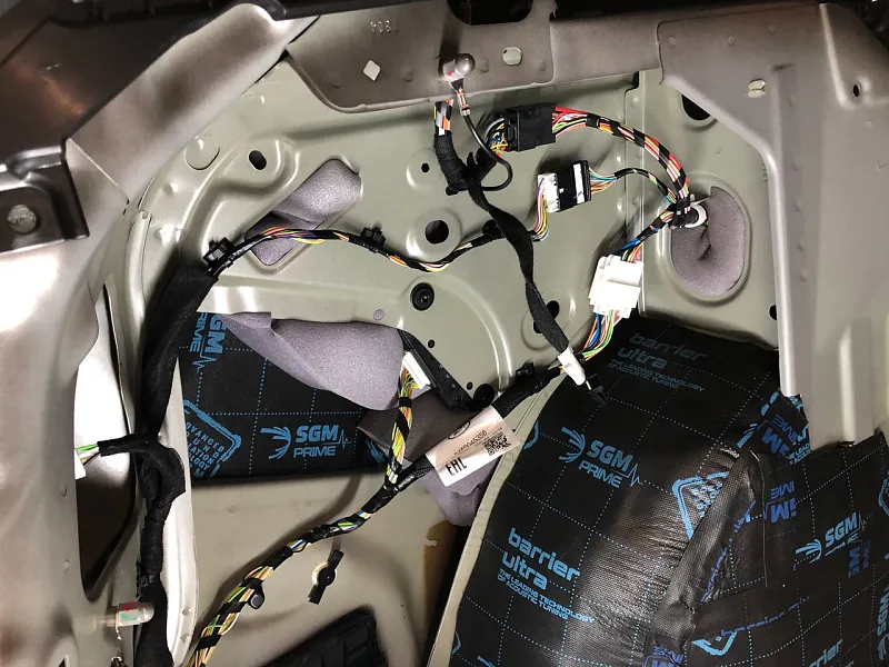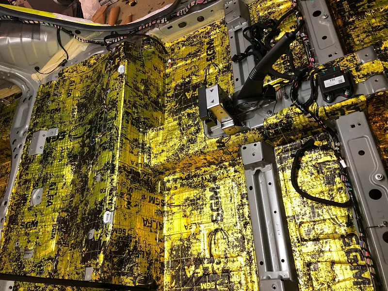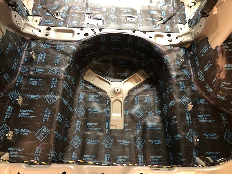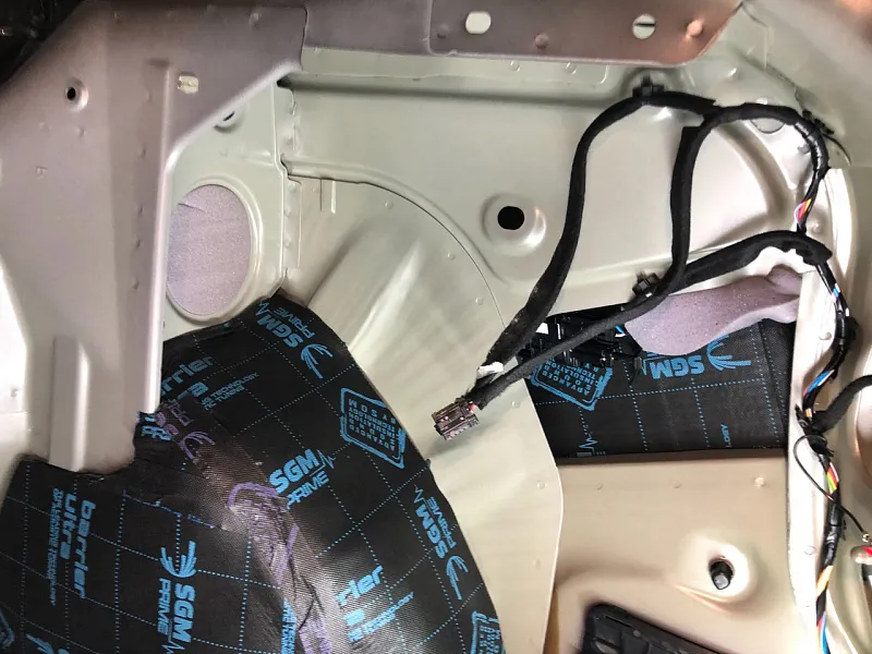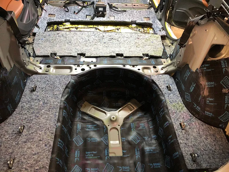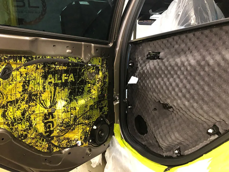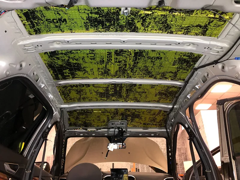 Что касается эффекта снижения общего шума, в двух словах объяснить сложно, но давайте попробуем. Ранее мы сказали, работаем с материалом по технологии, так давайте про технологию. Первым слоем всегда выступает виброизолиционный материал, он служит для снижения частоты резонанса металла “постучал по двери после шумоизоляции, звук глухой” – Это работает только в случае мастичной виброизоляции, но только ее мы и используем, поэтому о других не будем . Вторым слоем наносится шумопоглатитель, от его качества и зависит главный результат, мы используем закрытоячеистый мембранный материал, который является самым эффективным на рынке установочной линейки SGM Prime. Это своего рода симбиоз разных материалов собранных в “бутерброд”, выполняющего роль: теплоизолятора, вибродемфера, шумопоглотителя и влагозащиты. Конечные материалы это звукопоглотители “мягкие пирамидки “ данный материал наносится на все пластиковые элементы салона, в том числе на обшивки дверей. Совсем недавно в данный комплекс от производителя добавились акустические блоки. Материал размещающийся в скрытых полостях кузова, куда физически не может добраться рука мастера, тем самым, даже в центральной стойке между слоями метала, добавляется звукопоглатитель.