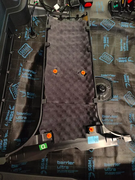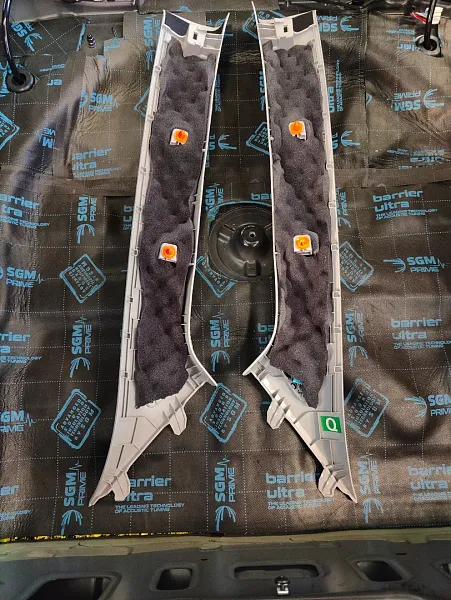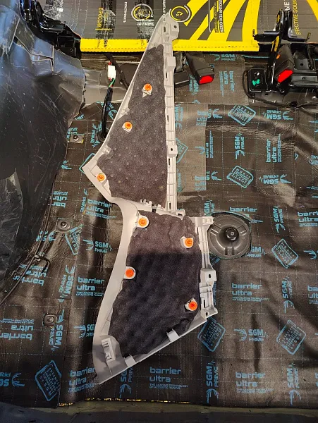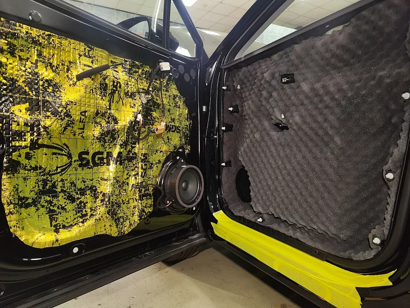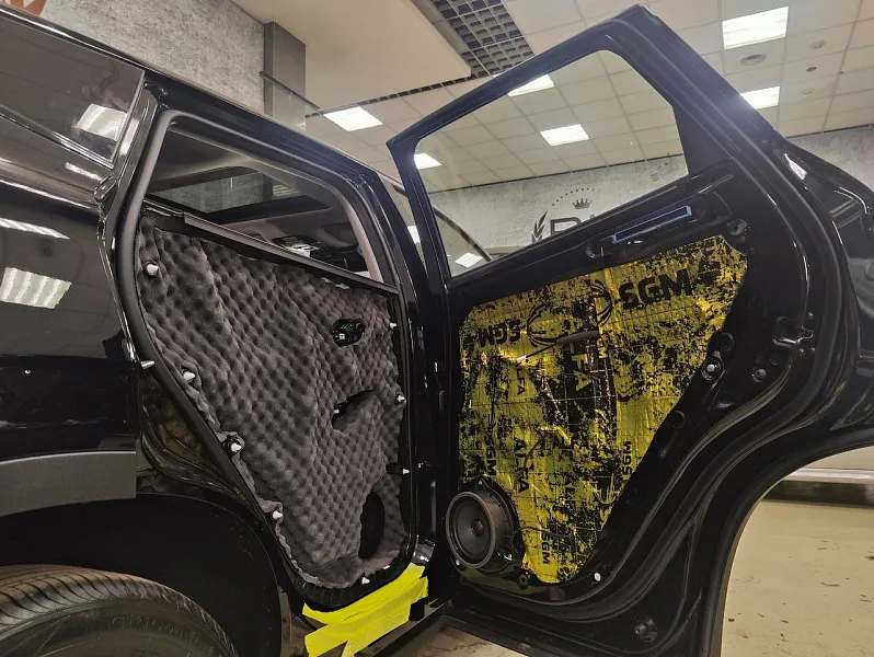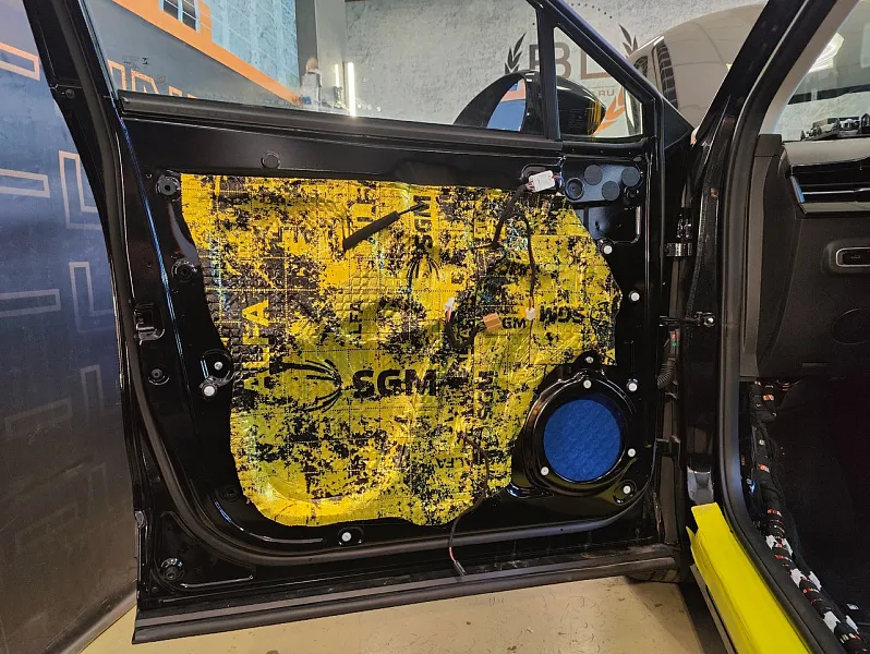 Что касается эффекта снижения общего шума, в двух словах объяснить сложно, но давайте попробуем. Ранее мы сказали, работаем с материалом по технологии, так давайте про технологию. Первым слоем всегда выступает виброизолиционный материал, он служит для снижения частоты резонанса металла “постучал по двери после шумоизоляции, звук глухой” – Это работает только в случае мастичной виброизоляции, но только ее мы и используем, поэтому о других не будем . Вторым слоем наносится шумопоглатитель, от его качества и зависит главный результат, мы используем закрытоячеистый мембранный материал, который является самым эффективным на рынке установочной линейки SGM Prime. Это своего рода симбиоз разных материалов собранных в “бутерброд”, выполняющего роль: теплоизолятора, вибродемфера, шумопоглотителя и влагозащиты. Конечные материалы это звукопоглотители “мягкие пирамидки “ данный материал наносится на все пластиковые элементы салона, в том числе на обшивки дверей. Совсем недавно в данный комплекс от производителя добавились акустические блоки. Материал размещающийся в скрытых полостях кузова, куда физически не может добраться рука мастера, тем самым, даже в центральной стойке между слоями метала, добавляется звукопоглатитель.