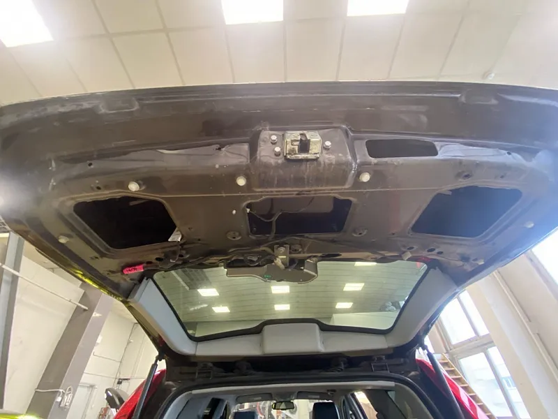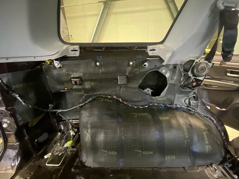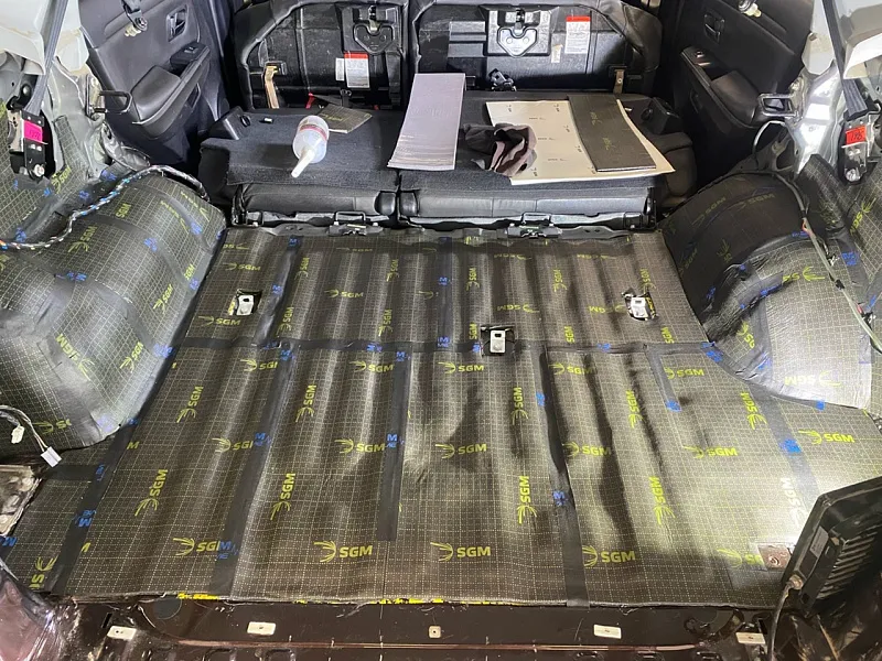 Позволяет снизить шум глушителя, уменьшить шум дороги, и значительно снизит шум задних арок. Первым слоем на пол багажника, крылья и арки прикатываем виброизолятор SGM Альфа 3, вторым слоем наносим сэндвич материалов SGM Silshot – многослойный мембранный материал, сочетающий в себе как звуко и теплоизолирующий слой, так и акустическую мембрану. Все стыки заклеиваем стыковочной лентой, также не забываем про крышку багажника обрабатываем в 2 слоя материалами SGM Альфа 3 и Шумоизоляция SGM-ВЭЛ 10.