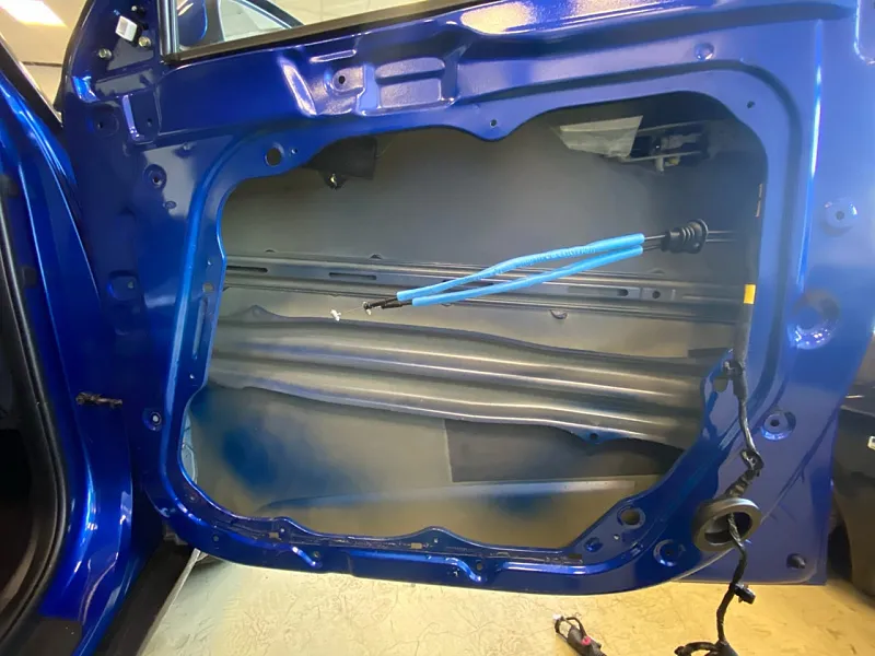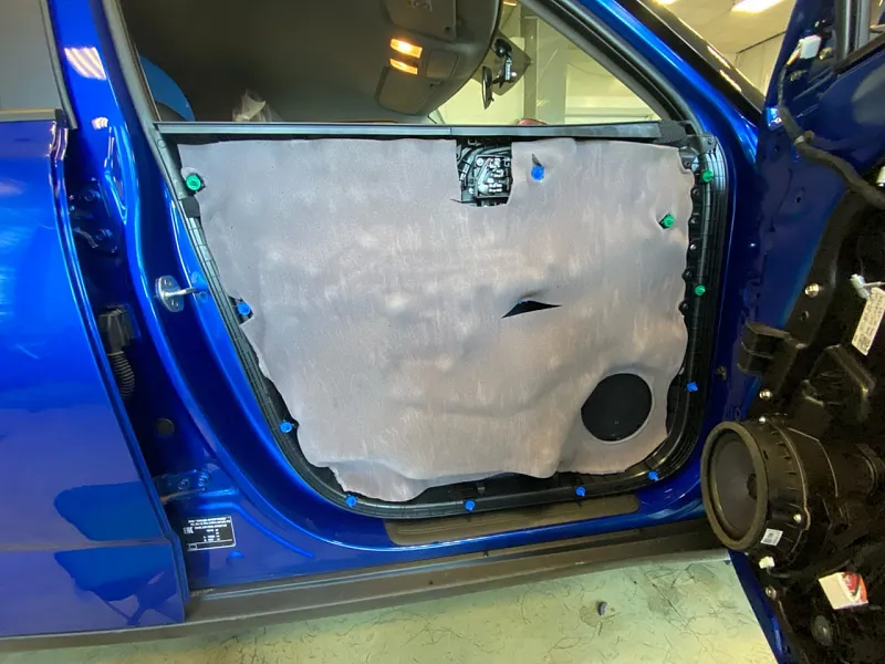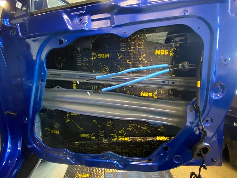 Первым делом необходимо сделать двери. Шумоизоляция дверей самая важная процедура для получения тишины в салоне, т.к. суммарная площадь всех дверей является наибольшей среди всех остальных элементов кузова. Снимаем обшивку двери, крепим стекло на малярный скотч и демонтируем механизм стеклоподъемника, обезжириваем поверхность и клеим первый слой SGM АЛЬФА 3, он позволяет нам избавиться от эффекта консервной банки и придать приятную увесистость двери. Вторым слоем наносим SGM BARRIER ULTRA PRIME - это своего рода сэндвич из материалов - самый эффективный закрытоячеистый мембранный материал с дополнительным вибродемпфирующим эффектом, и что не мало важно - влагозащищенное исполнение, т.к. внутри двери со стекла всегда стекает вода. Далее крепим механизм стеклоподъемника и устанавливаем обшивку двери на место, предварительно обработав ее звукоизоляционным материалом SGM-ВЭЛ 10.