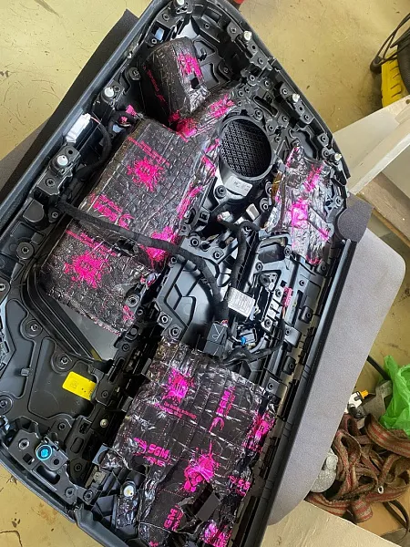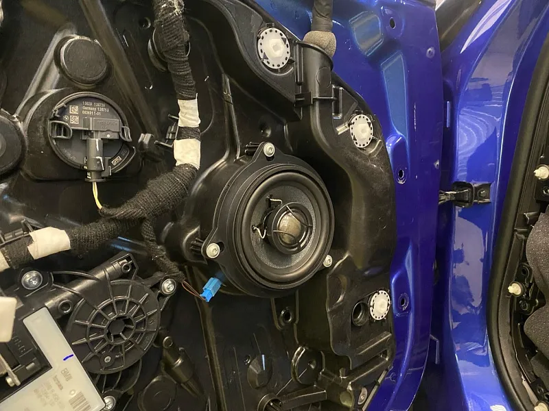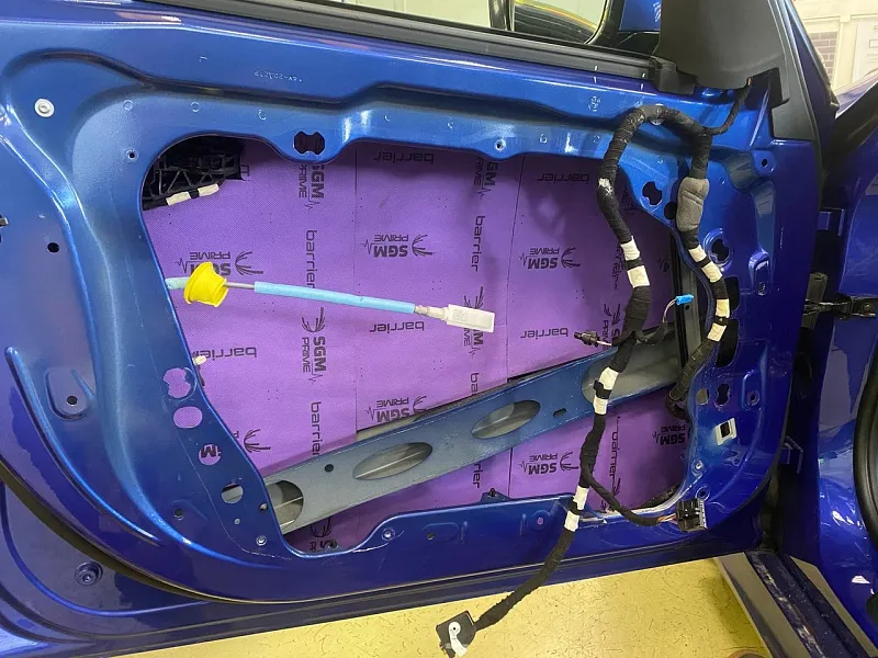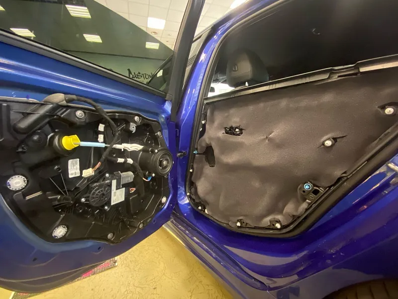 Естественно, перед установкой компонентов мы произвели шумоизоляцию и виброизоляцию дверей для более качественного и детального звучания акустики.