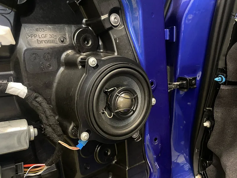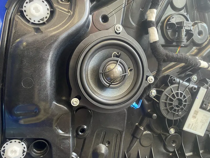 Акустика. За "СЧ" и "ВЧ" звено будут отвечать коаксиальные динамики DST DCX-BMW100P, т.к. в данной комплектации уголки зеркал не предусматривают установку твитеров, а в настоящие время заказать на новую модель бмв детали интерьера практически невозможно, компания Dynamic State выручает нас в данной ситуации своим динамиком со встроенным твитером под штатное место bmw. На мидбас вместо грустных 16см динамиков встали НЧ динамики диаметром 20см DST DSW-BMW202P, что, кстати, интересно, во всех моделях bmw G И F серии подседельные мидбасы крепятся в корпус с помощью болтового соединения - проще говоря прикручены, а в данном G20 корпуса остались те же, но видимо, для удешевления теперь их просто вклеивают без применения болтов, грустно, но мы все сделали как и ранее, прикрутив новые мидбасы к корпусу.