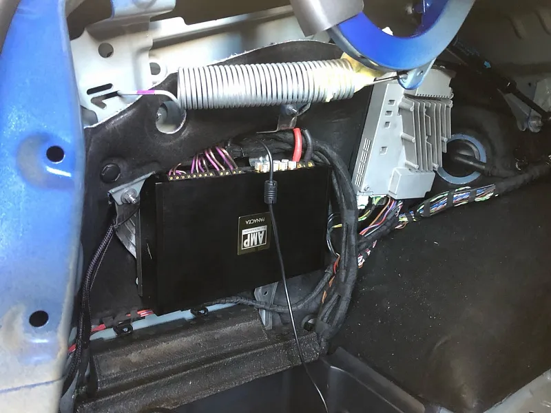 Преступим. Сердцем системы станет процессорный усилитель AMP Panacea DA-80.6DSP ver.4. Благодаря встроенному процессору и очень гибкой конфигурации на его базе можно построить множество комбинаций аудиосистем: от простой «фронт», «тыл» и сабвуфер, до сложных многополосных решений. Компактные размеры позволяют установить этот усилитель в скрытых полостях автомобиля, что очень важно в подобных автомобилях, согласитесь, очень глупо в подобной бмв будет выглядеть усилитель на спинки сиденья, поэтому, благодаря компактным размерам мы спрятали его за обшивкой крыла в багажнике.