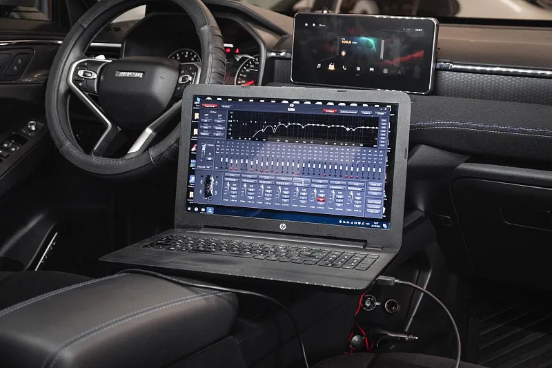 Монтаж и настройка аудиосистемы: Мы установили всю аудиосистему по штатным местам, а усилители - под пассажирским сиденьем. Чтобы сэкономить бюджет, мы не стали изготавливать скрытый корпус для сабвуфера - динамик установили в стандартный закрытый корпус. Это не повлияло на качество звука, но немного уменьшило пространство багажного отделения. Перед передачей автомобиля клиенту мы потратили более 3 часов на настройку и корректировку “АЧХ”, что позволило получить звучание, близкое к “домашнему”, с визуализацией звука в центре салона.