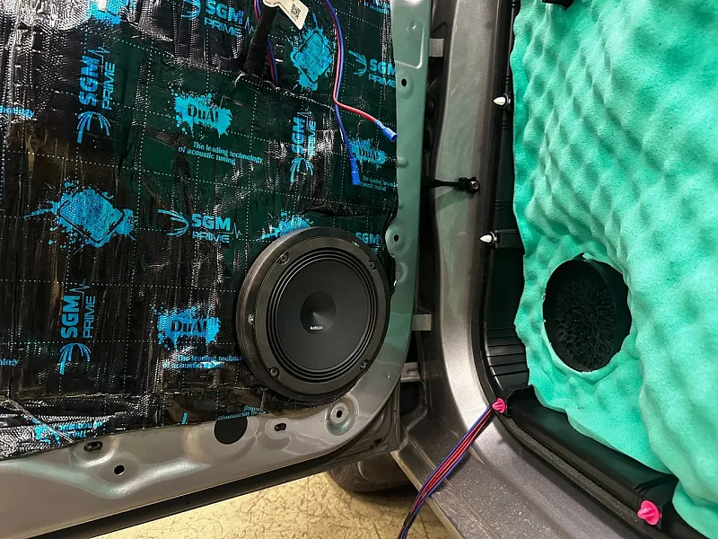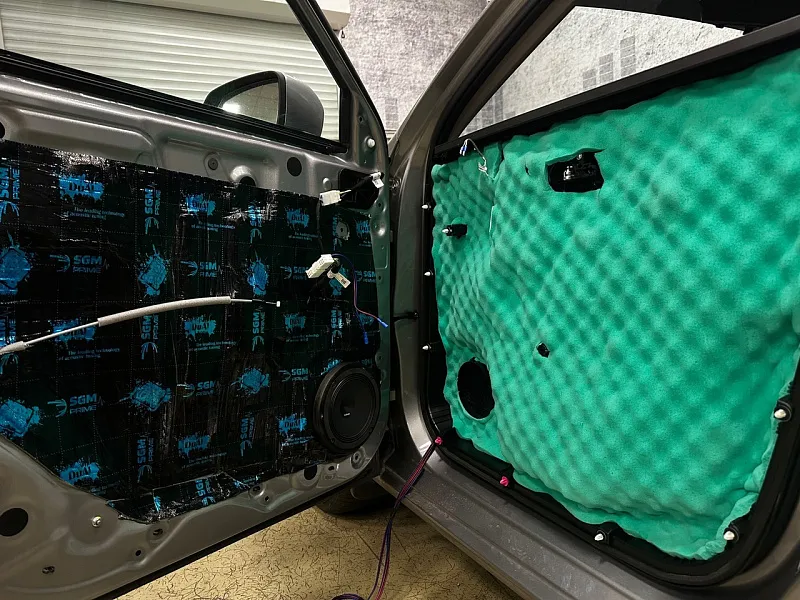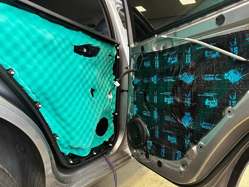 Предварительные работы по установке акустической системы в автомобиль включали в себя использование материалов SGM Prime для подготовки мест установки динамиков. Мы использовали два слоя виброизолятора SGM Dual толщиной 4 мм и звукопоглощающего материала ComfortMat Soft Wave для обработки пластиковых обшивок дверей. Эта процедура необходима для создания оптимального акустического пространства внутри двери, что позволяет динамикам работать правильно без посторонних шумов и вибраций от элементов кузова автомобиля.