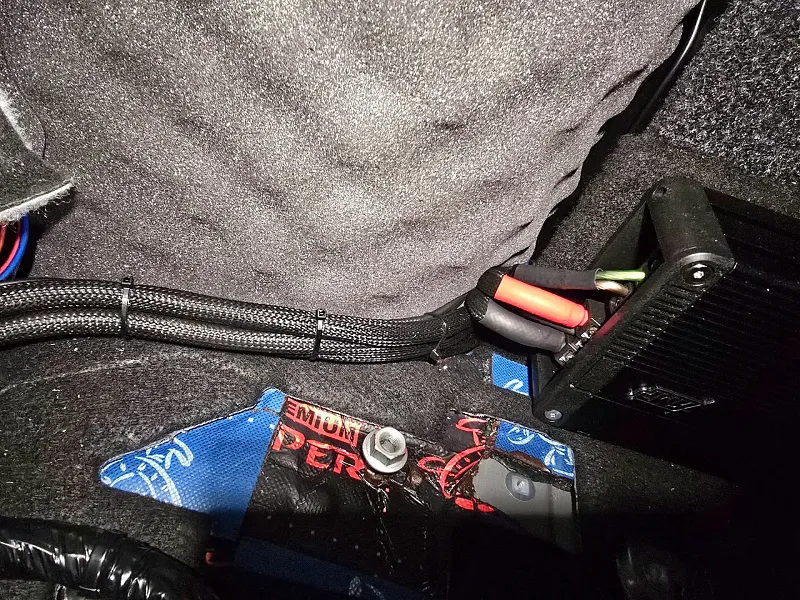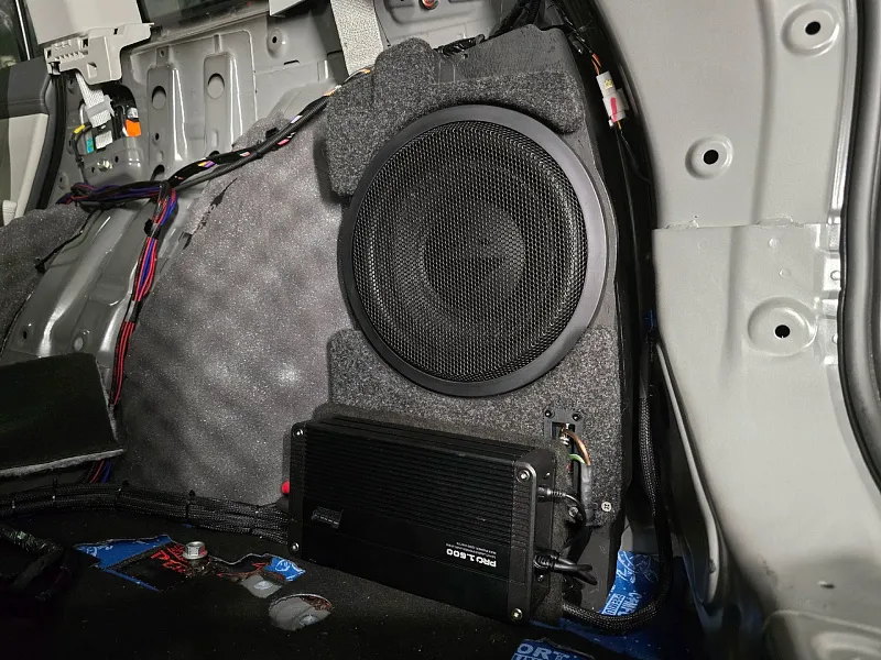 4. Установка компонентов и настройка системы: Все оборудование установлено по штатным местам, усилительная часть размещена в багажнике. Сабвуфер размещен в компактном корпусе “стелс” под штатную сетку заводской обшивки. Звук в автомобиле стал намного ярче, появился запас по громкости, за счет сабвуферного динамика аудиосистема стала намного объемнее с приятной отдачей по “низам” и легкой вибрации.