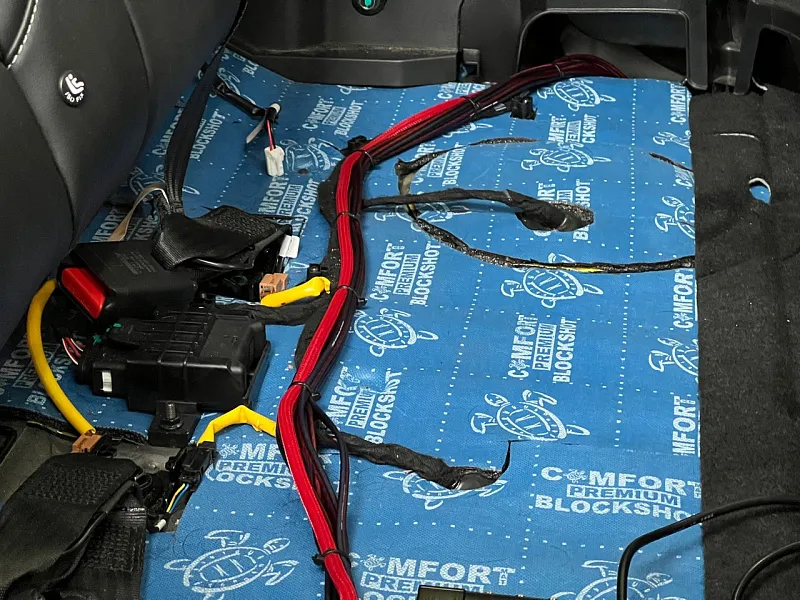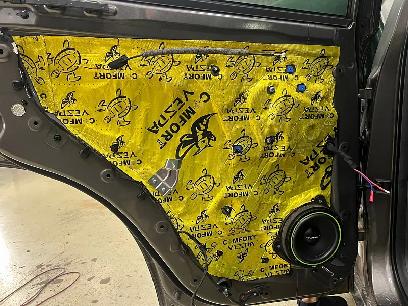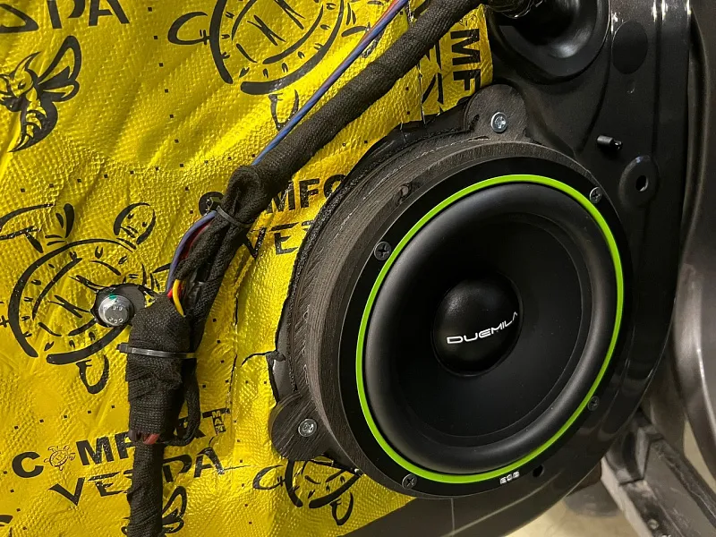 Монтаж системы. За этот год мы сделали более 10 аудиосистем на Джили атлас про, поэтому данная установка выполнялась уже на опыте, расположение усилителя за задним сиденьем, место там более чем достаточно, подключение к штатному головному устройству выполнялось с помощью высокоуровнего подключения. Штатную проводку мы не трогали, подключились с помощью пинов к штатным разъемам динамика. Для монтажа акустики изготовили проставочные кольца под заводское крепление. Работа по подключению и настройке аудиосистемы заняла 1.5 дня.