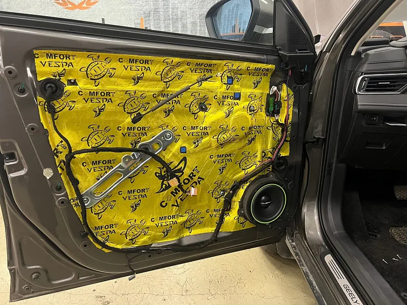 Задача сразу скажем не из простых, очередной Джили атлас про на замене динамиков, или установке процессорного усилителя. В бюджет, который мы рассматривали с клиентом просто не уместить сабвуфер и процессорный усилитель, поэтому от сабвуферного звена мы отказались.