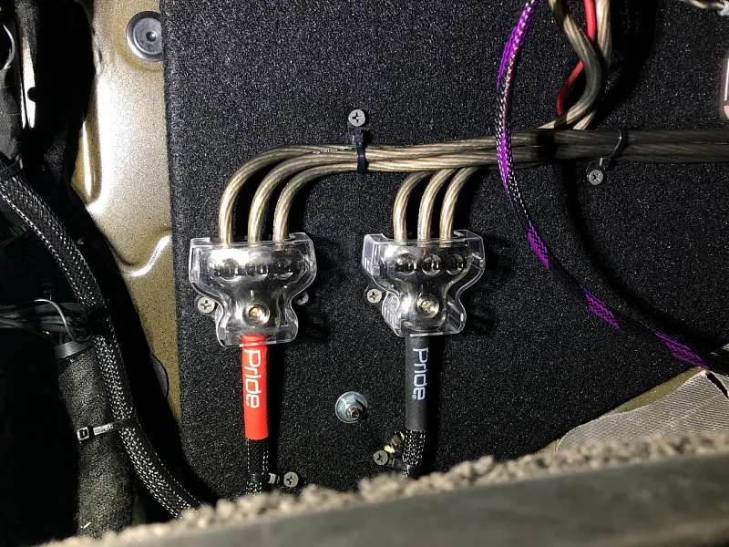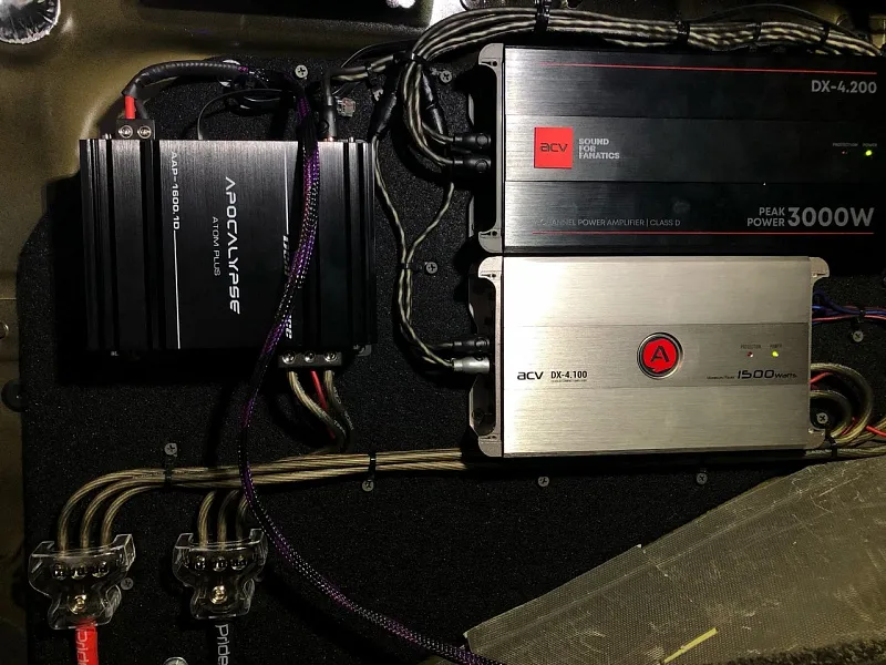 Усилители на акустику мы использовали от компании Acv серии DX, 4.100 встал на вч и его старший собрат 4.200 на сч звено, нам доводилось устанавливать данные модели и минусов мы не обнаружили, малый размер, отлично собран, хороший кпд. На усиление сабвуферного звена выбрали компактный усилитель бразильской схемотехники Apocalypse AAP-1600.1D ATOM PLUS за свою цену хороший усилитель.