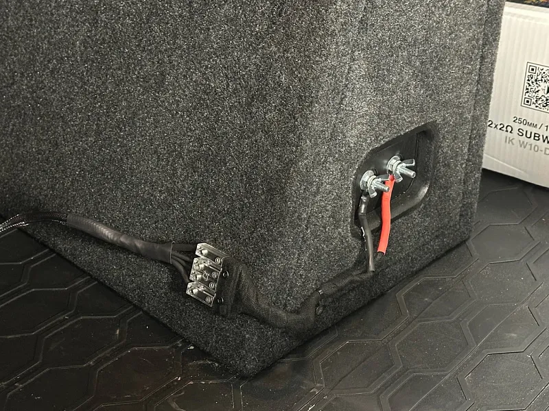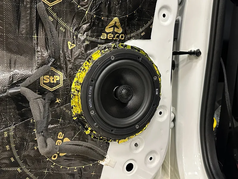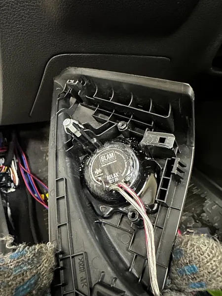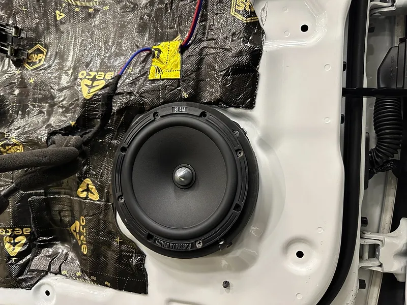 2. Акустические компоненты: Все оборудование было приобретено клиентом самостоятельно, и к слову в его задачу это сделано безупречно, если бы данная задача стояла перед нами мы бы не поменяли ни оного компонента. Акустика в штатные места на фронт и тыл Blam Relax, отличная акустика для простых процеусей с небольшой мощностью для спокойных жанров. Сабвуферный динамик Helix ik10s, про него мы упоминаем в каждой статье, безупречный динамик от немецкого производителя, с великолепным звучанием.