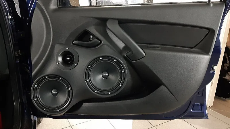 Для Lada Granta у нас много решений, для данного авто мы выбрали фабричные накладные подиумы под 2x16 и рупор, т.к это сильно экономит бюджет системы наряду с изготовлением подиумов из стекловолокна, и сильно выигрывает по звучанию против систем по штатным местам тем более что штатные места у гранты под 13см коаксиальный динамик.