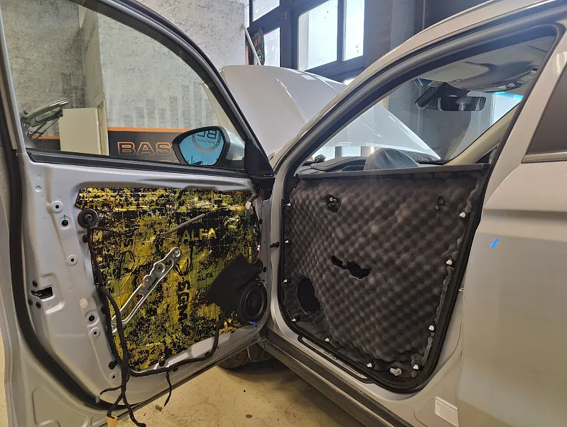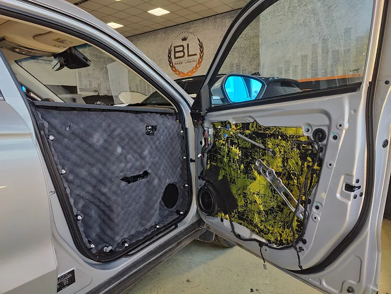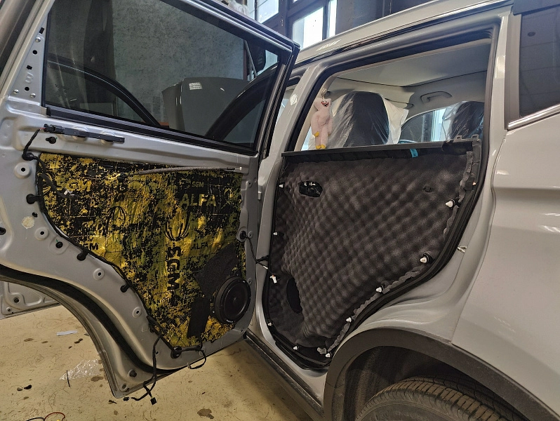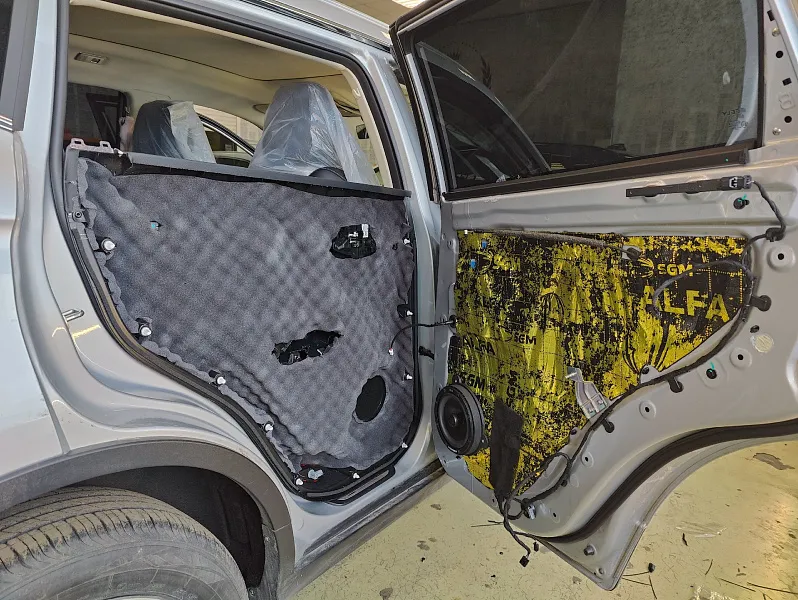 Была выполнена шумоизоляция дверей в четыре слоя с использованием специализированных материалов. Такая обработка снижает внешний шум, убирает паразитные вибрации металла и создаёт правильные условия работы динамиков.