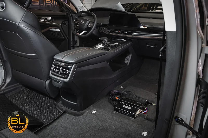 3. Усилители системы: Вся система подключена к процессорному 6-канальному усилителю Hellion HAM 6.80 DSP, который позволяет управлять аудиосистемой с штатного головного устройства и подключать телефон напрямую к процессору для улучшения качества звука. Для усиления сабвуфера используется компактный моноблок AMP PRO 1.600.