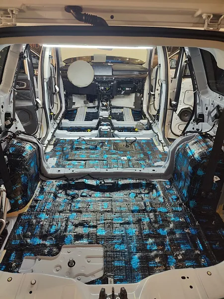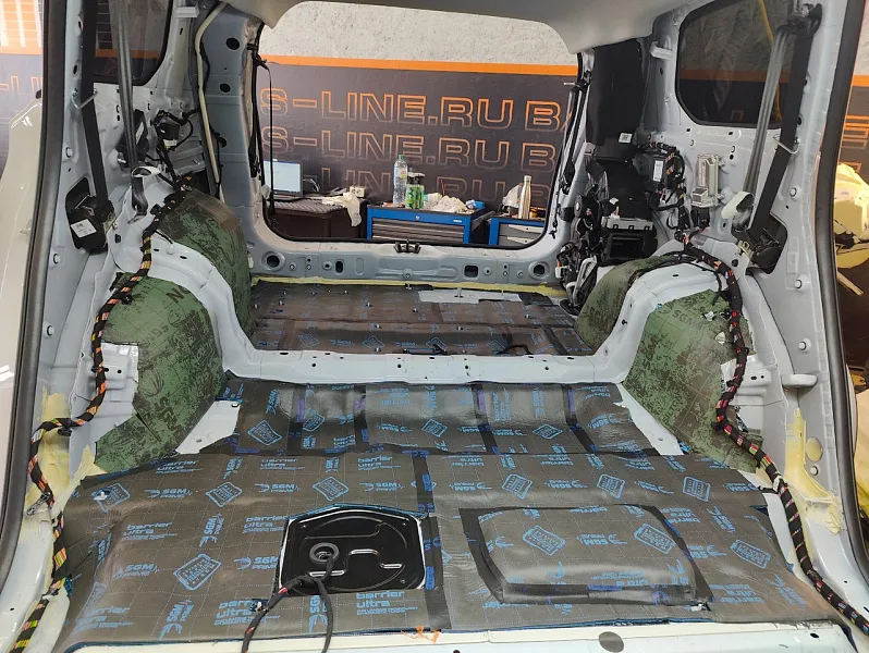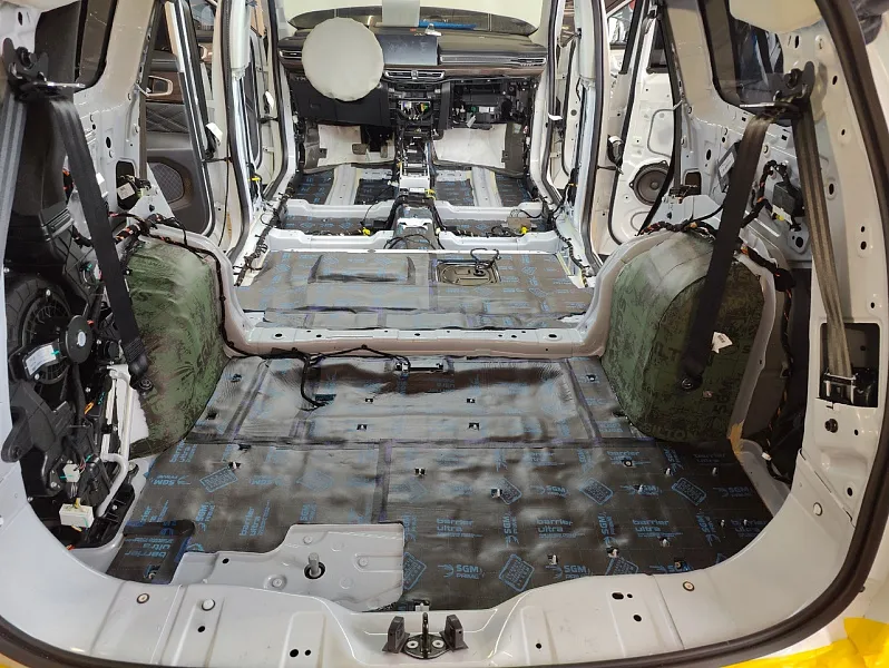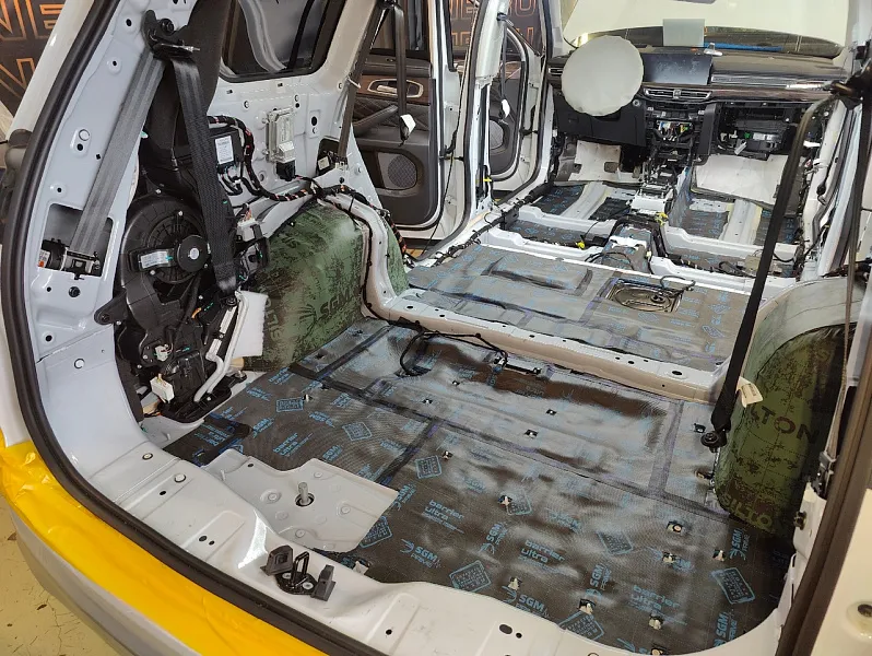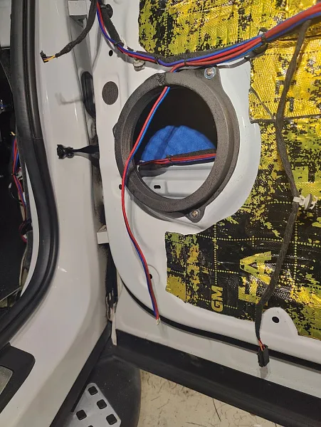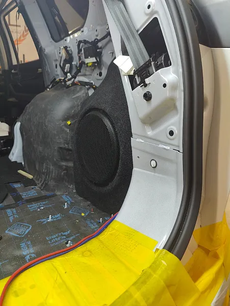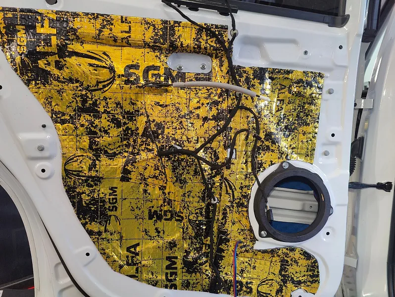 Шумоизоляция салона авто. Для начала мы провели работы по шумоизоляции авто. Шумоизоляция дверей была выполнена для: 1) Снижение шума внутри автомобиля, в современных авто все больше коже в салоне но меньше комфорта и шумоизоляции. 2) Акустическая подготовка дверей для установки акустической системы. Двери обрабатывались в четыре слоя: первый слой - вибродемпфер SGM Альфа 3mm, второй слой - мембранный шумоизолятор SGM Barrier Lite, за динамиком установлена акустическая линза Comfort Mat Tsunami, предназначенная для устранения акустических отражений, стоячих волн и наложения волн (эффект “эхо”). Третий слой - вибродемпфер SGM Альфа 3mm на внутренней стороне металла двери, четвертый слой - звукоизолятор Sgm vel 15mm. Помимо этого, была проведена шумоизоляция пола и колесных арок.